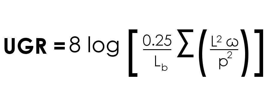 UGR คำนวณโดยใช้สมการที่คำนึงถึงปัจจัยหลายประการที่อาจส่งผลต่อแสงสะท้อนที่เกิดจากโคมไฟ เช่น มุมของโคมไฟ ความน่าจะเป็นของแสงสะท้อน และค่าความสว่าง (เอาต์พุตลูเมน) สมการที่ใช้ในการคำนวณ UGR คือ: